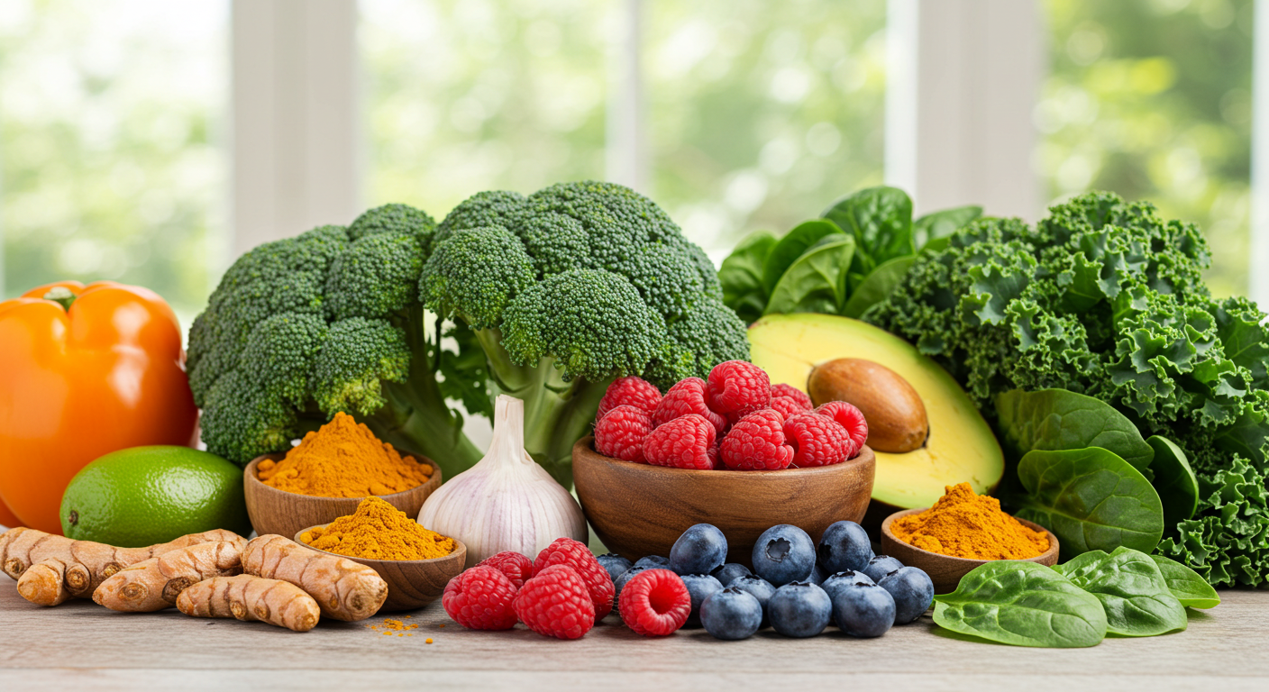 - 암 예방 음식: 녹색 잎채소, 베리류, 마늘, 브로콜리, 강황 등 항산화 성분 풍부한 식품 섭취.